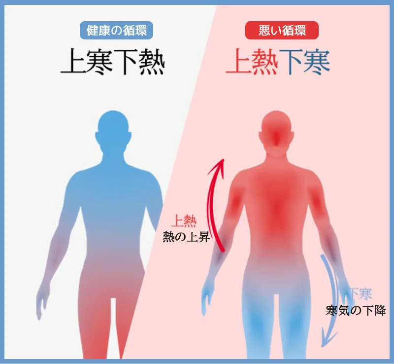 頭がのぼせてしまっている時は頭に血が集まっていますが、手足末端や特に足元の血は少ない状態であり、局所的な血虚を生じていると言えます。