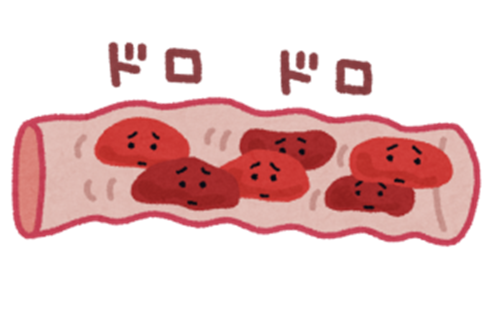 血はしっかりと血液内の酸素が巡っていると赤くてサラサラしていますが、逆に酸素濃度が落ちてしまうと茶~黒っぽくなり、トロトロ~ドロドロしてきて、もっと悪いと塊ができてしまいます。